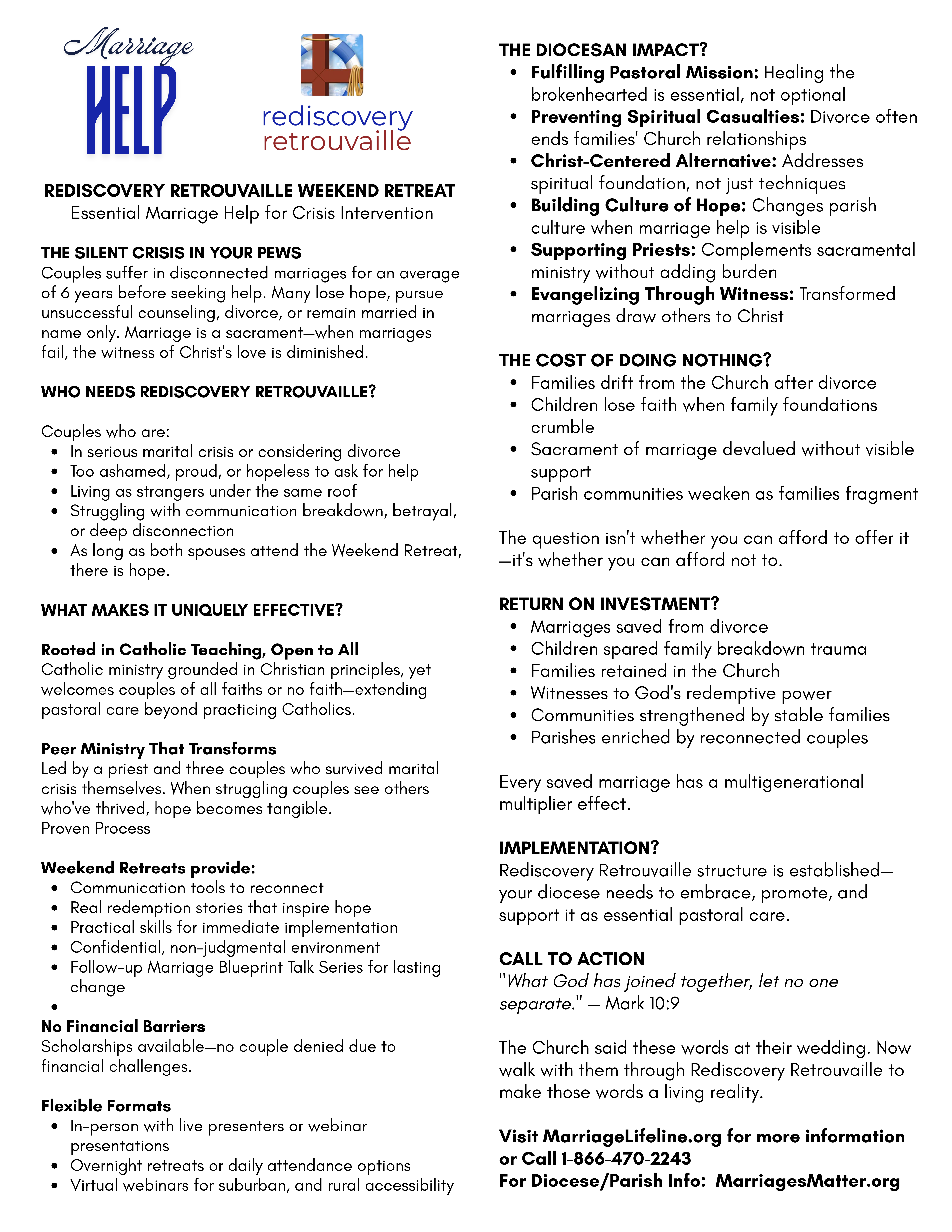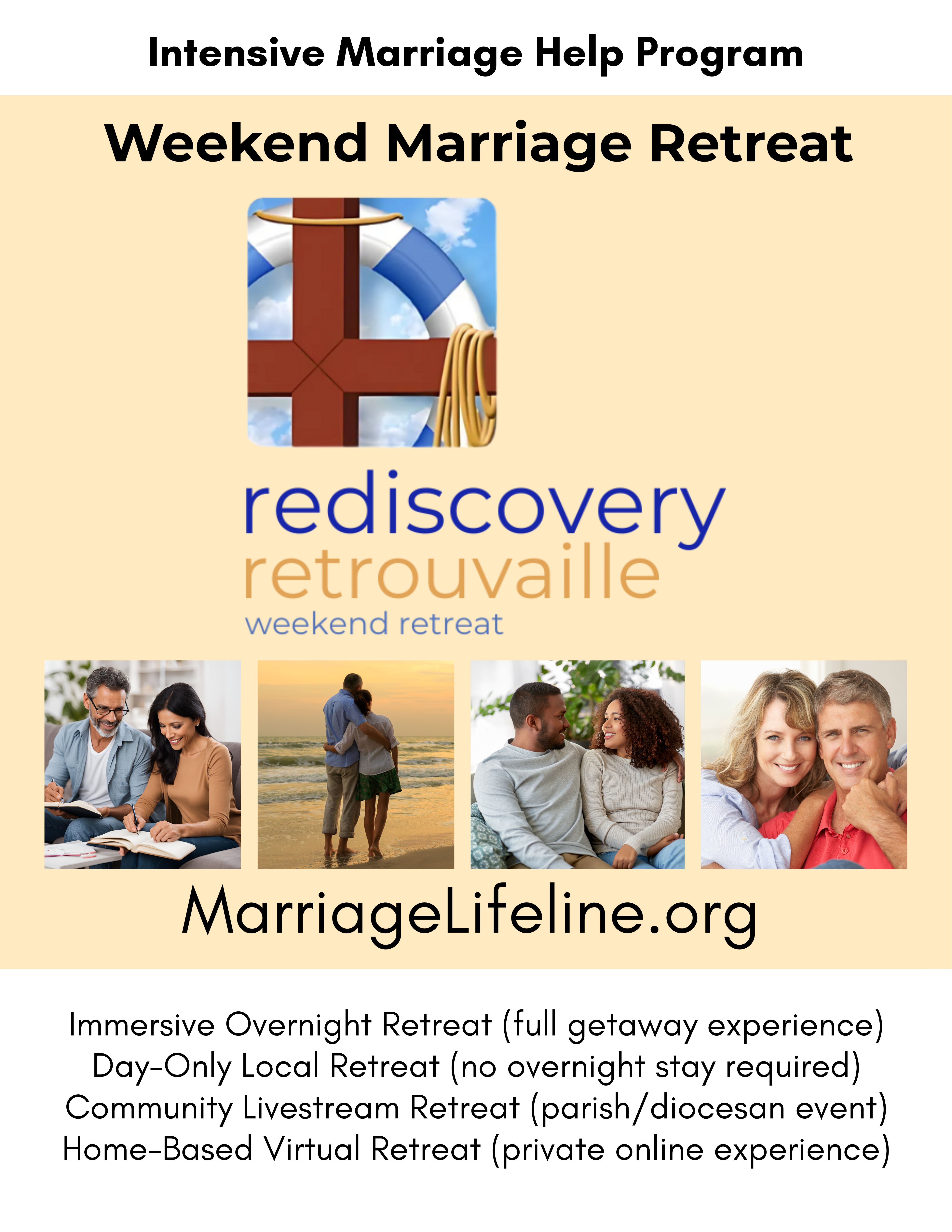 For information on bringing Rediscovery Retrouvaille to your diocese, or for couples seeking help, visit www.MarriageLifeline.org or call 1-866-470-2230.