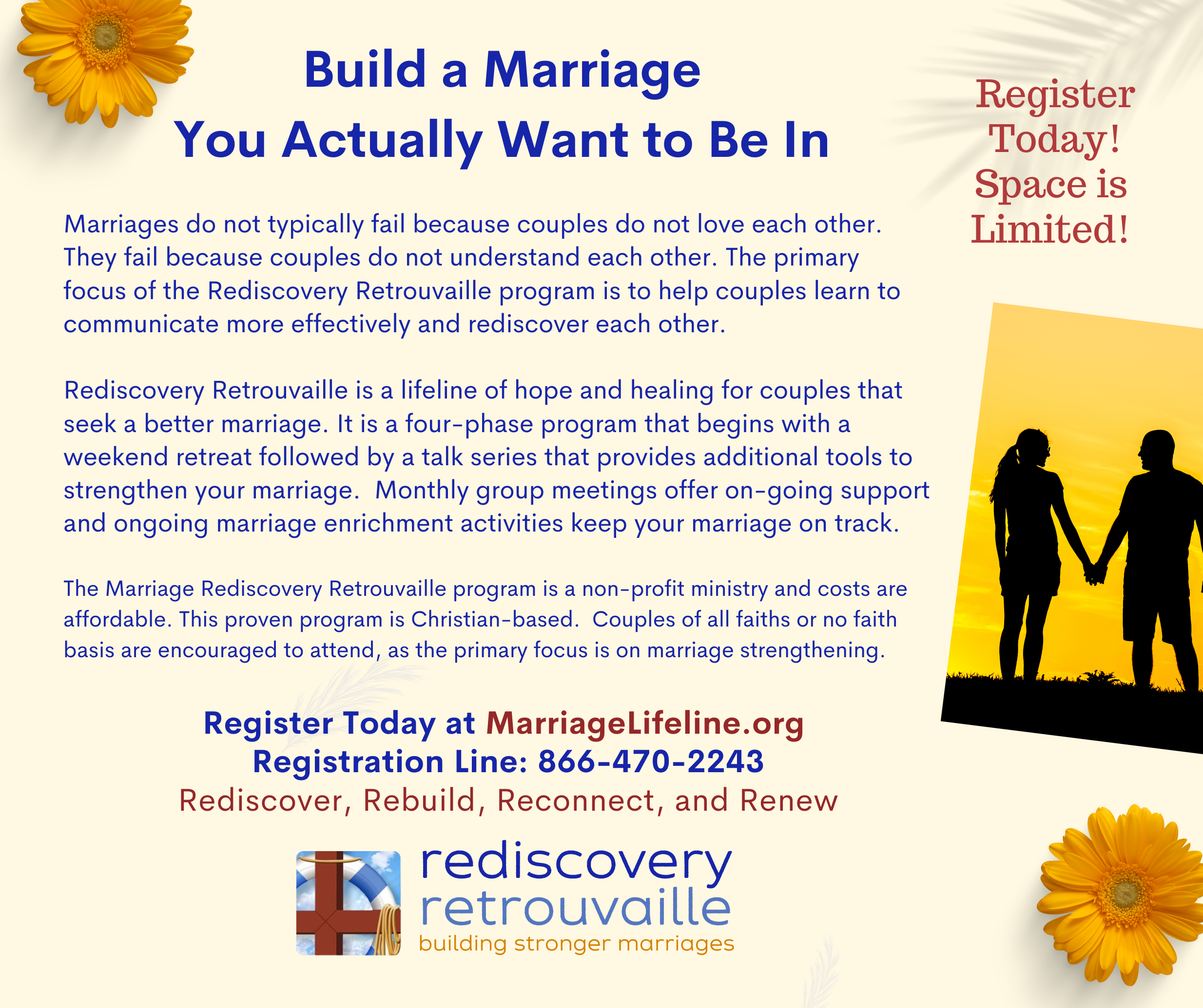 Every marriage saved through Rediscovery Retrouvaille marriage help has a multiplier effect that extends through generations. The children of that saved marriage will learn what covenant love looks like. The couples will mentor others and share how marriage help transformed their relationship. The parish will be strengthened. The Kingdom of God will advance.